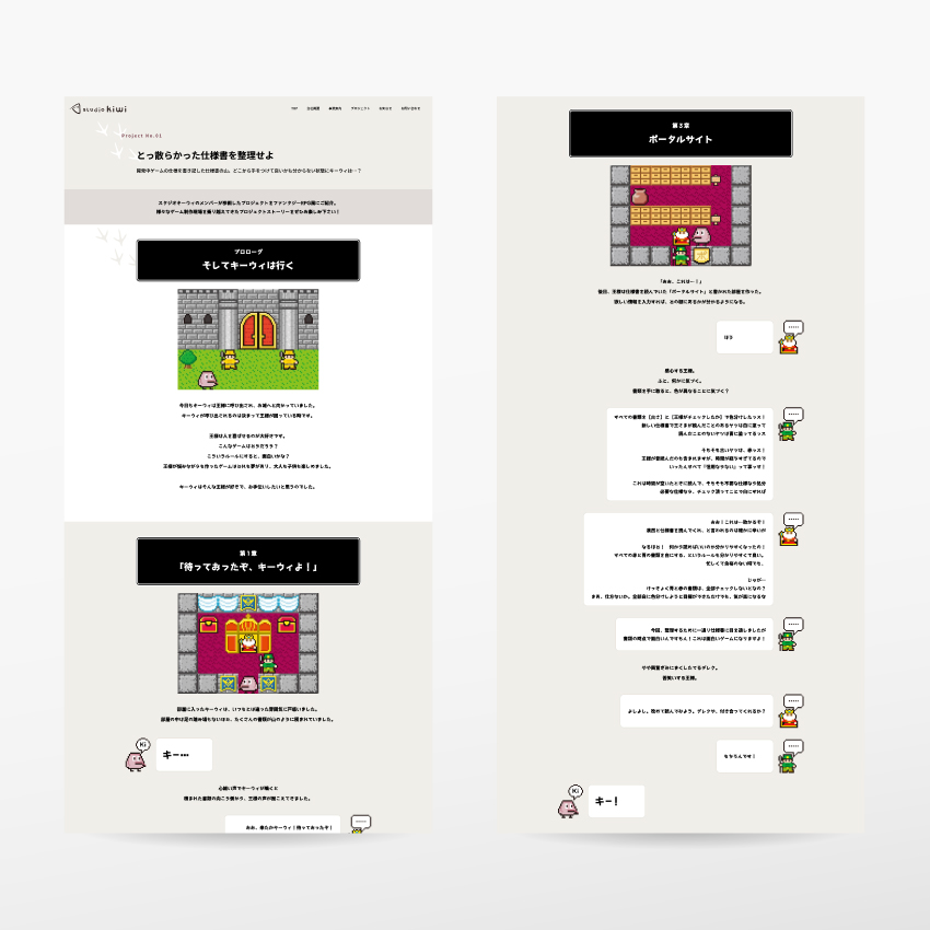 大枠が固まってきた頃、最後の山場は事例の見せ方でした。案件の性質上どうしても現状課題を抱えた現場に後からジョインすることが多いため、特定の現場とわかってしまったり、うっかりディスってしまうわけにもいかないので、ストーリー自体は非常に面白いのにWebサイトに掲載しづらいという悩ましい問題がありました。それを解決するためにやったのが、ドット絵によるRPG調で伝える事例ページ。ドット絵なのでgifアニメとの相性もよく、僕としては人生初めてドット打ちを経験することになったのです。
