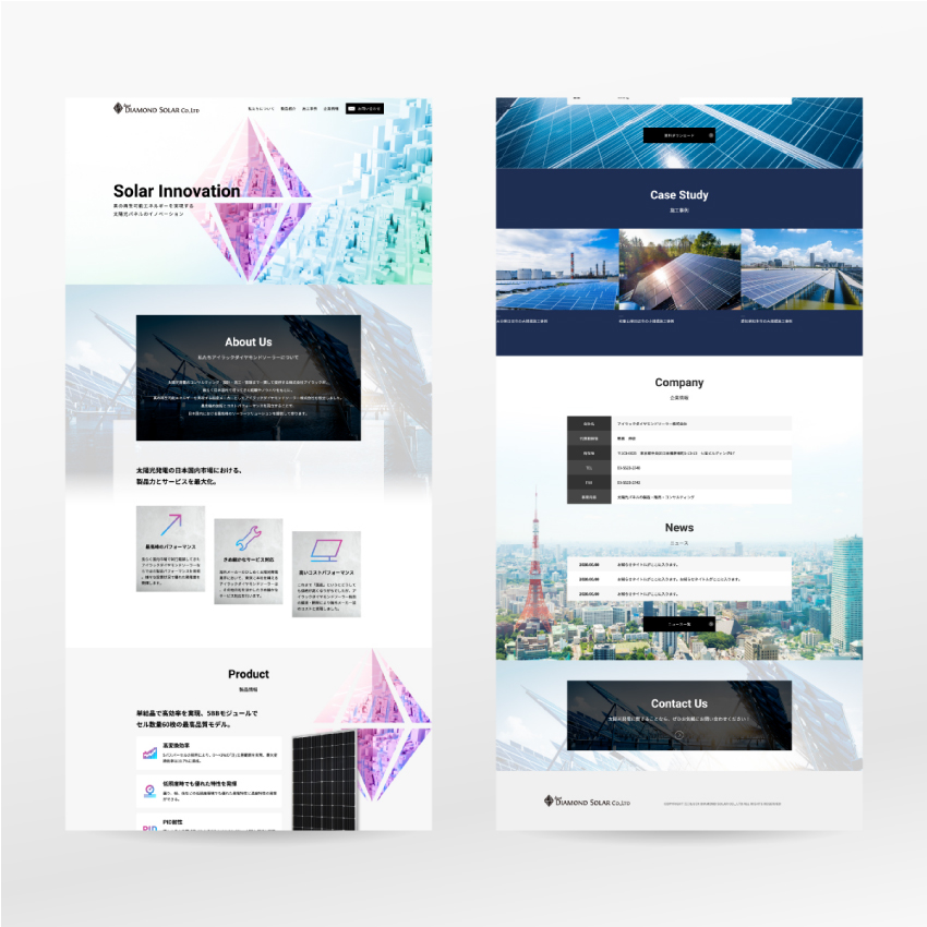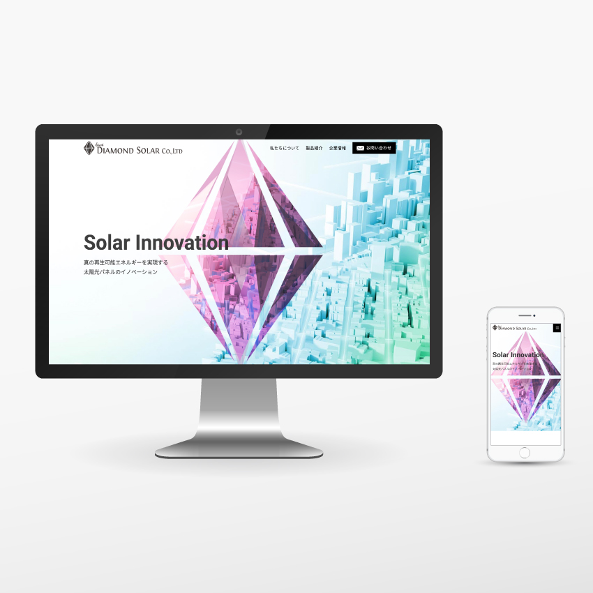 BtoBのWebサイトやパンフレットというと、クオリティと言っても何となく地味な絵面を想像するかもしれません。そのまんまの製品カット、何となくの使用シーン、抽象的なビジュアル…。確かにこうしたデザインはよくあるのですが、今回は新規立ち上げということもあって、ビジュアルをアイコニックなものにすることで見込み客に思い出してもらえるようなデザインアプローチを取ることにしました。そして、社名の通りダイヤモンドのように光り輝くことで太陽光パネルのクオリティ感を表現することと、その光は社会を照らすこと、その2点を包括したキービジュアルを生み出して初回提案に臨んだところ、ぜひこれで進めたいということになりました。