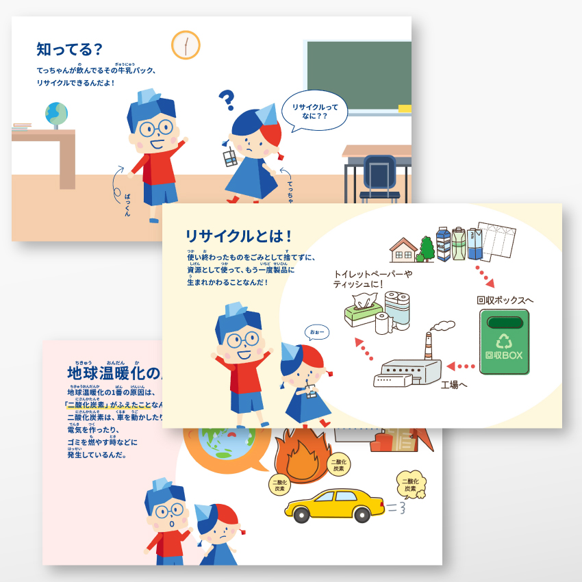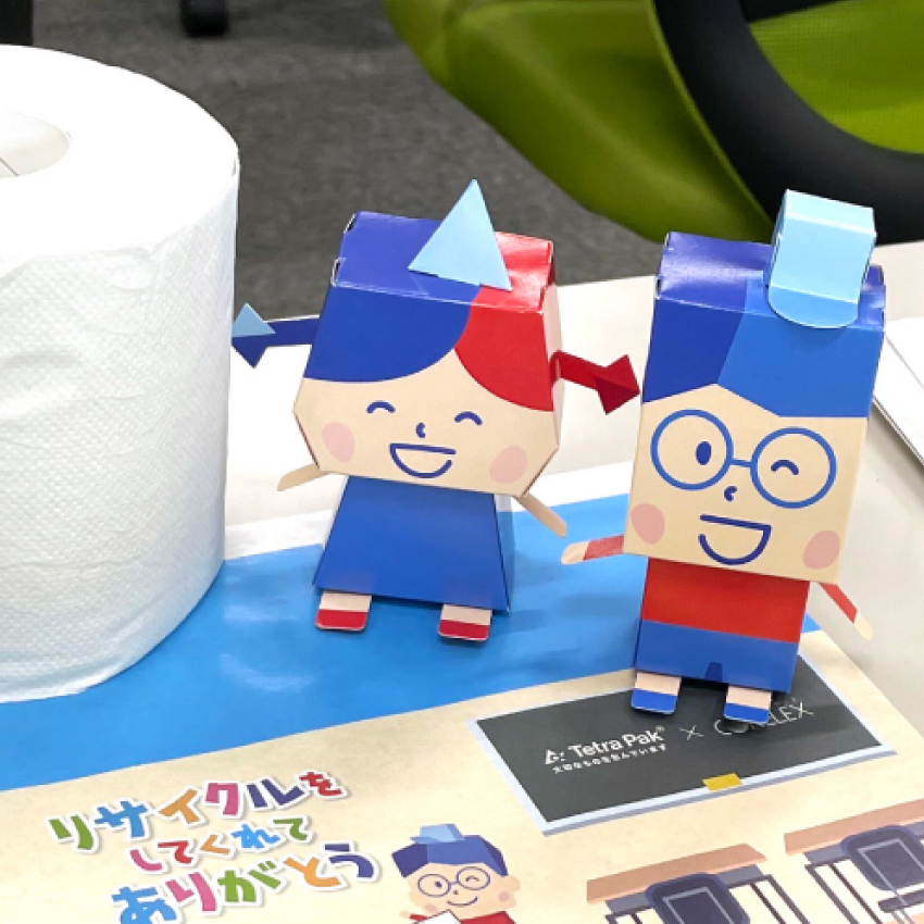 こうして立ち上がったプロジェクトは見た目に楽しく興味の引きやすいものとなり、工場見学でも案内ツールやノベルティグッズなどを彩ることになります。ワッカデザインが特設サイトでサービス添加しているペーパークラフト事業「キャラだち」も制作することができ、子どもたちが競い合うようにペーパークラフトを組み立てる様子はこちらとしても感無量。こうして、ややもすればちょっとお堅い内容になりがちなSDGs、リサイクルというテーマをデザインの力を使うことで自然な形で啓蒙することに寄与できたのでした。