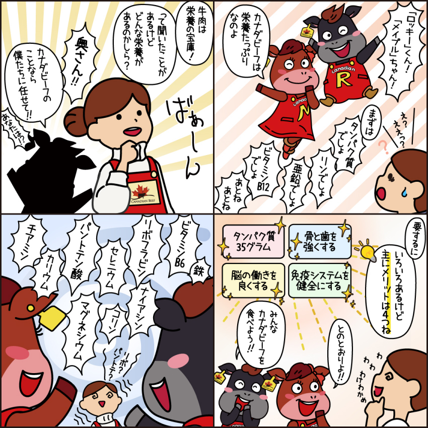 まずは、今回は牛肉がお題なので、牛肉はどういった栄養があるだとか、どういう環境で牛が育てられているとか、食の安全性がどうとか、そうした内容を4コママンガで伝えるというのをSNS上で1年間やりました。私たちは漫画家でもなければ編集者でもないので、その意味では毎回ネタを出してネームを書くというのも結構大変な労力だったりもしますが、イラストが得意なデザイナーと考えるのが得意なデザイナーで役割分担をすることに。続けていくうちにたいぶ愛着も出てきて考えるのが楽しくなっていったものですが、浮かばない時は本当に浮かばない。普段の仕事とはまた違った苦労を味わったものです。