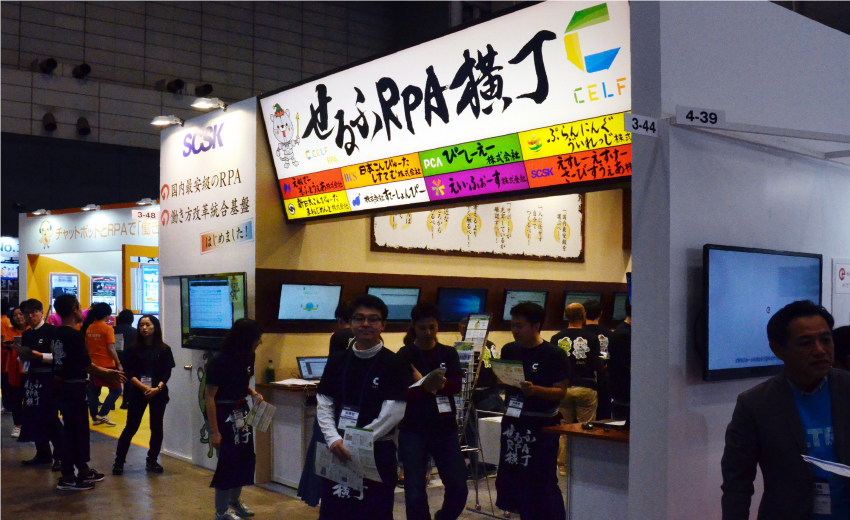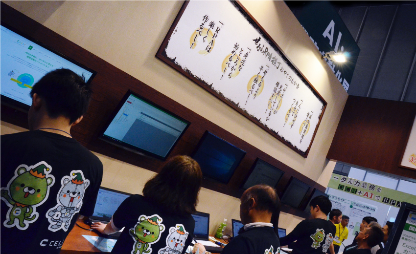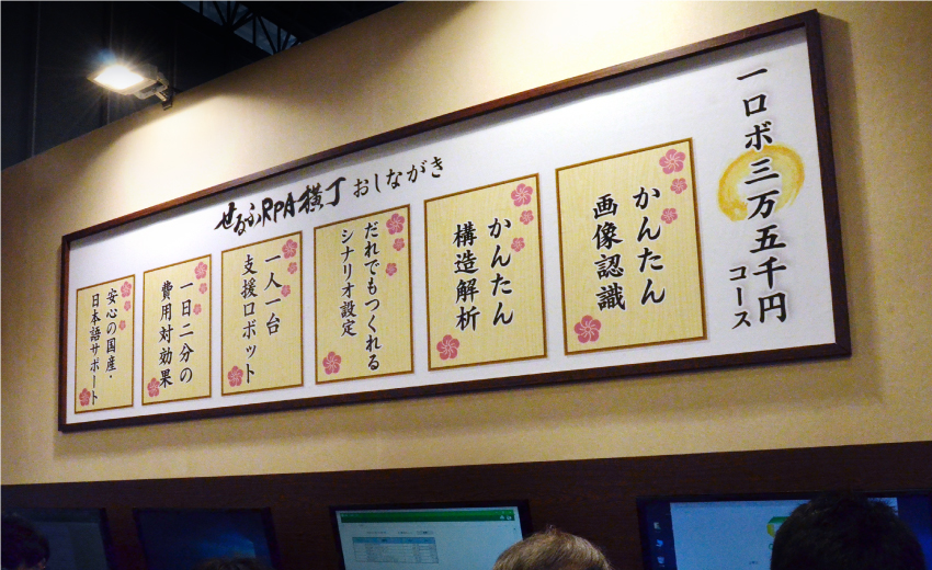 IT会社の展示会デザインを意外性のある“横丁風”デザインで手がけました。筆文字は知り合いの書家に依頼し、タイトル看板だけでなくブース内装飾も情緒たっぷりにデザイン、スタッフの衣装もTシャツのほか前掛けを作るなど、細部までこだわった作りとしました。およそIT業界らしくない見せ方ですが、それだけに広い展示会場の中でも目立ったブースとなり、多くの来場者にアピールすることができました。