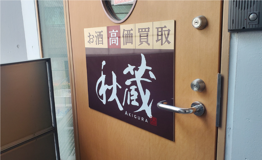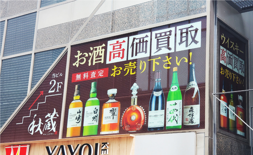 池袋で酒類の買取を専門に行う店舗のロゴデザインに続きファサードデザインを手掛けました。店内は採寸から行い内側から水張りして貼り付けられるようにデザイン、扉と1Fの表札はアルミ複合版で手配しています。