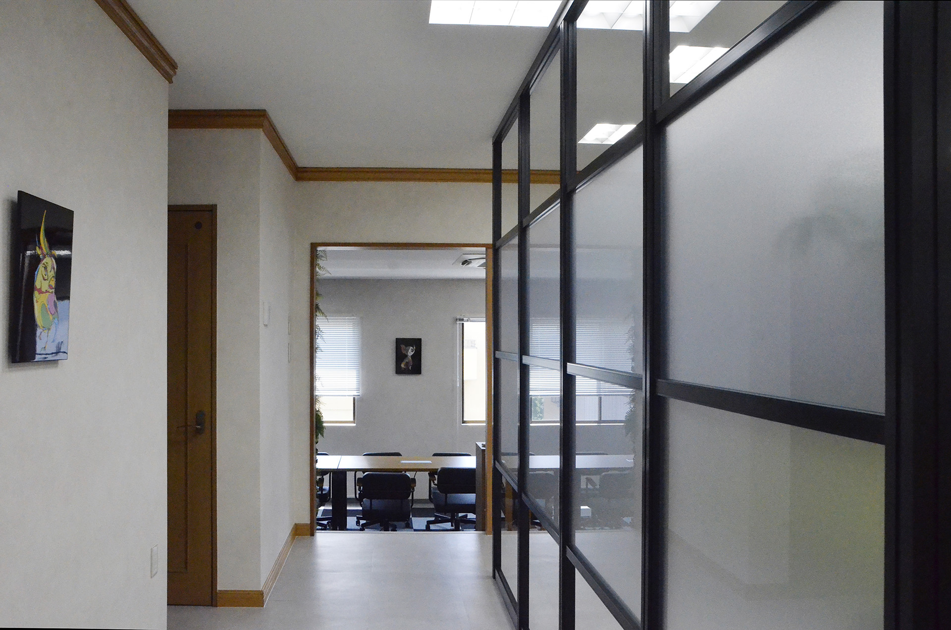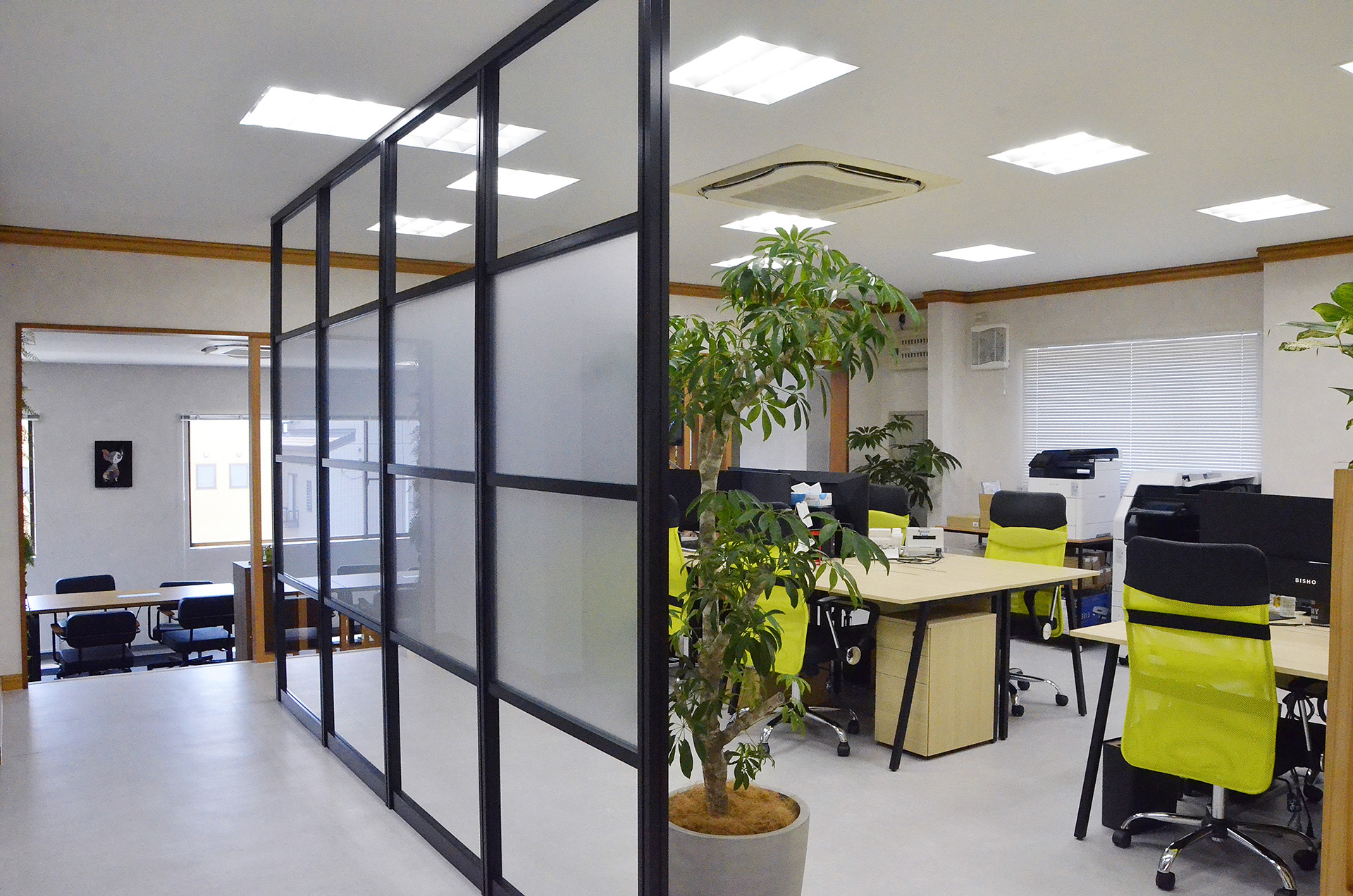 梱包・発送会社のオフィス内装を手掛けました。壁面やパーテーションなど動線設計から弊社で実施、おおまかなプランニングを行った上で、協力会社と共に正式図面を作成。トータル1,000万円規模のオフィス内装を手掛けることができました。打ち合わせスペースや会議室など使い勝手と雰囲気作りを両立させた空間に仕上がっています。