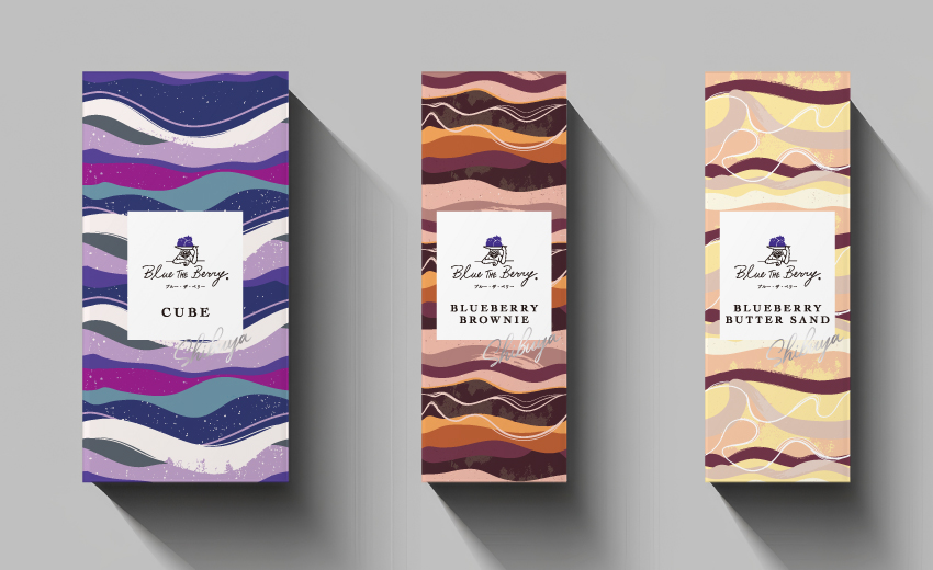 素材と手作りにこだわったブルーベリースイーツギフトのパッケージデザインを手がけました。大手ショッピングモールへの出店に際し、スイーツショップが数多く立ち並ぶ中、素材のシズル感を抽象的にイメージしてデザイン。店頭にディスプレイした際に存在感を放つように意図しています。